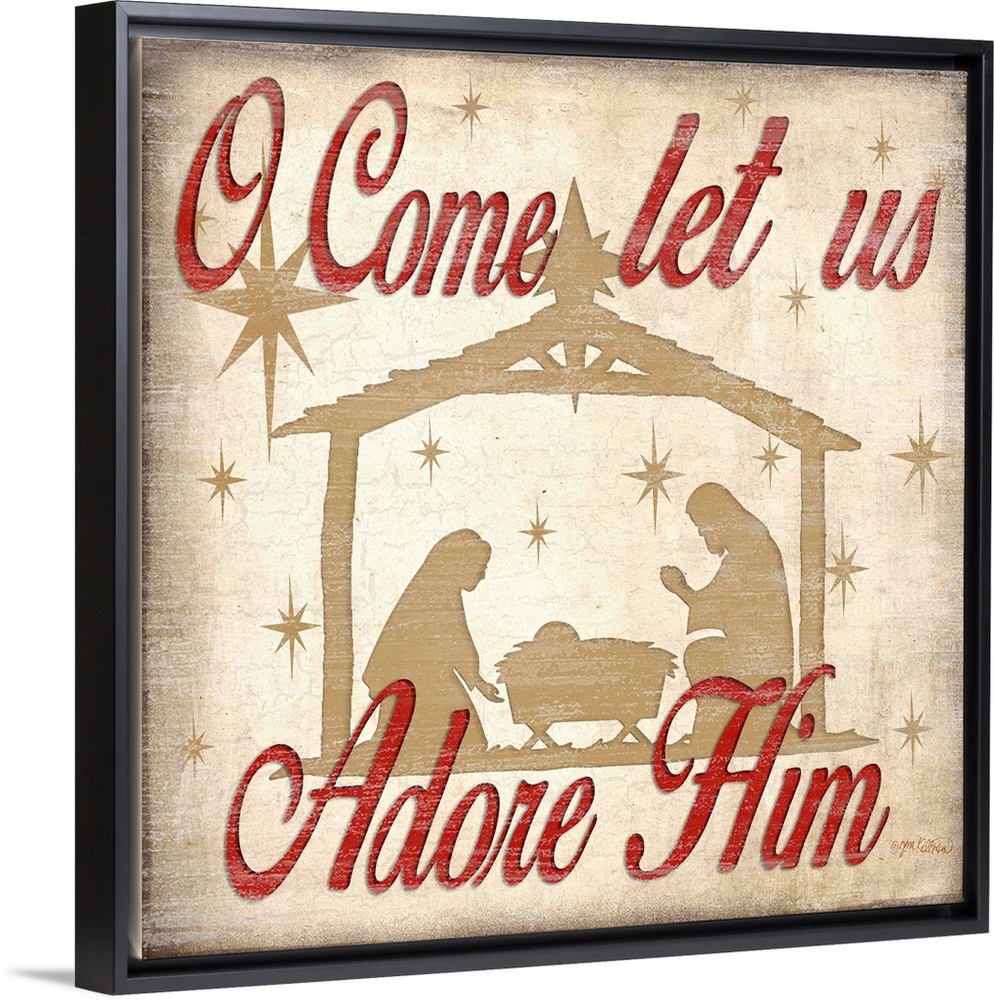 <p>"O Come Let Us Adore Him" in red with a nativity scene silhouette in brown and stars with a distressed overlay.</p>