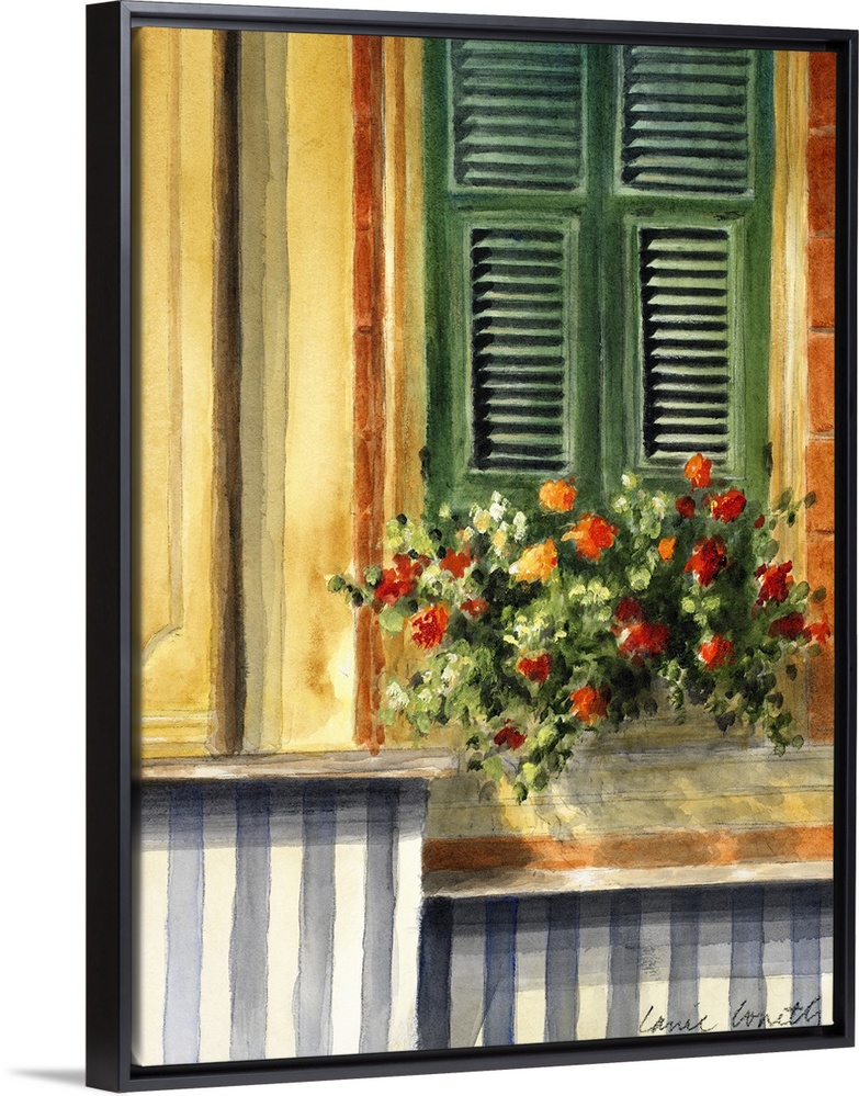<p>This home docor is a contemporary painting of a shuttered window with a small flower box at its base.</p>