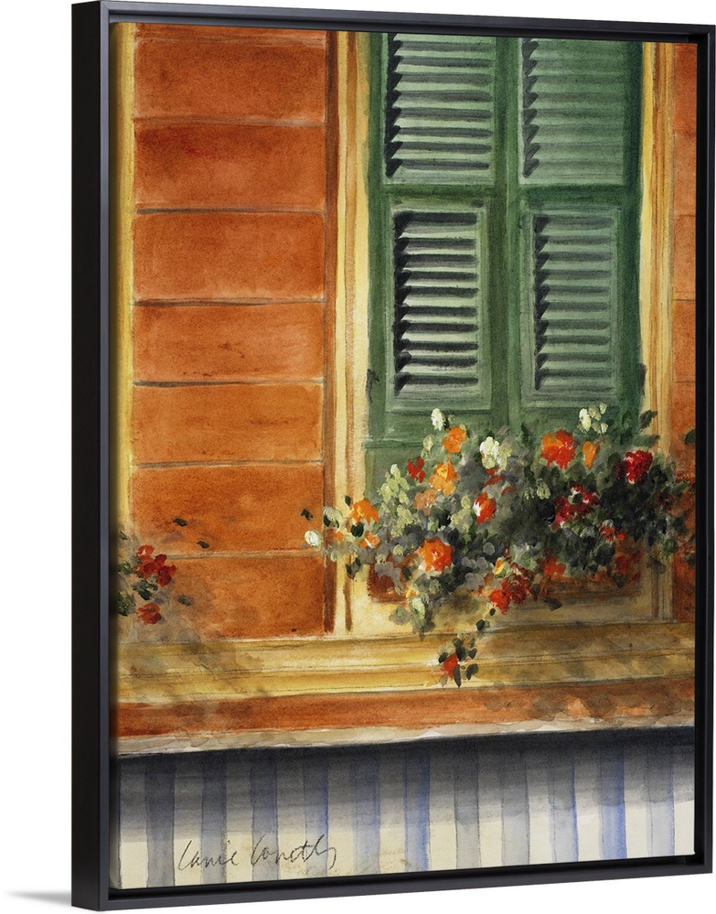 <p>A painting of flowers that sit in a pot just below a window with green shutters that are closed.</p>