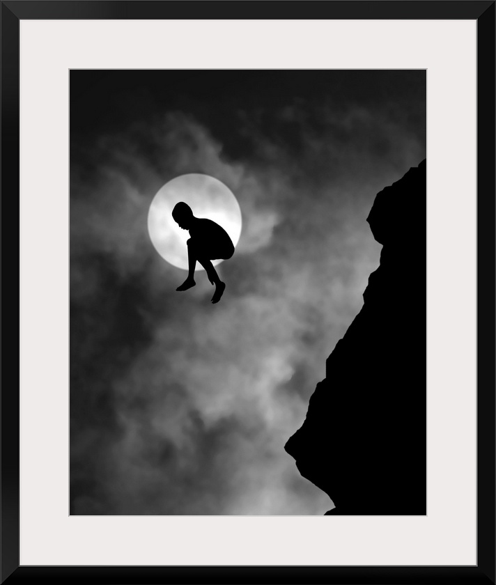 <p>Silhouette of a person jumping off a cliff, with the moon directly behind.</p>