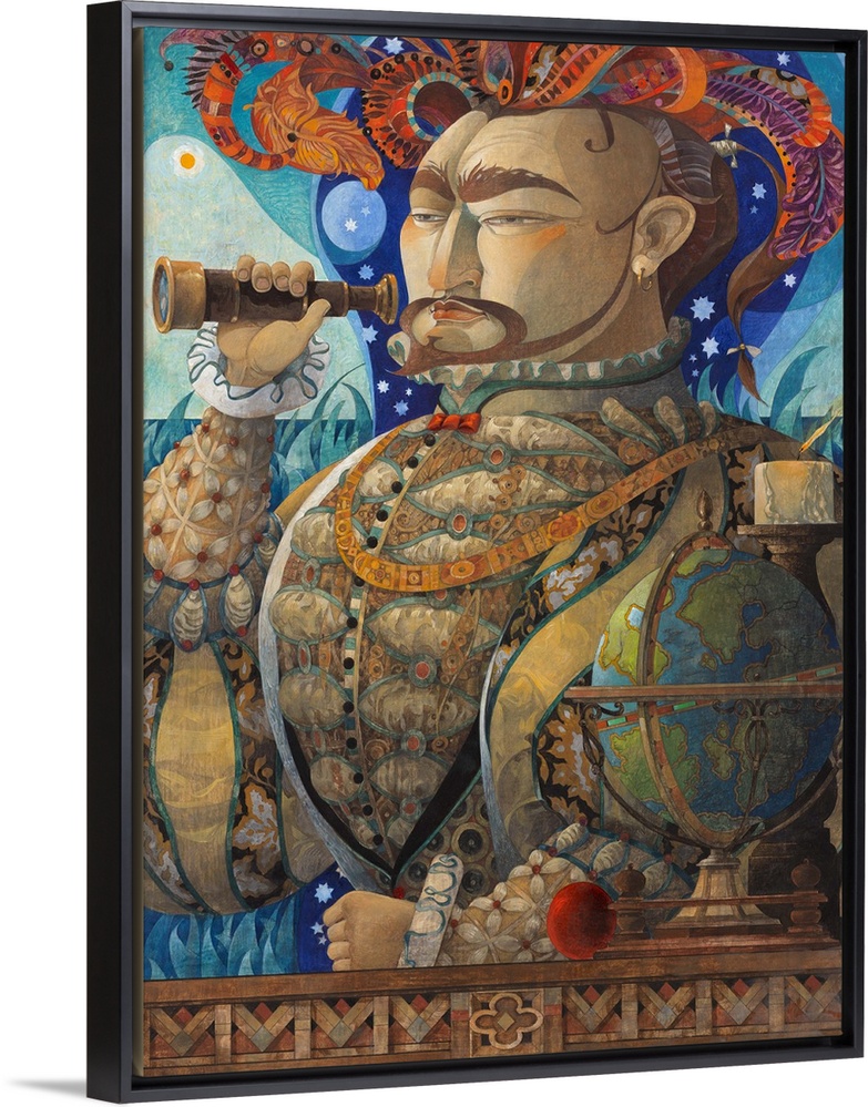 <p>Contemporary artwork of an explorer holding up a telescope, against a decorative background.</p>