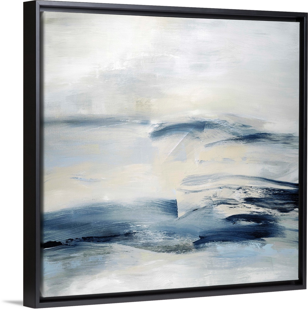<p>Square abstract painting with deep blue tones mixed in with gray, cream, and white.</p>