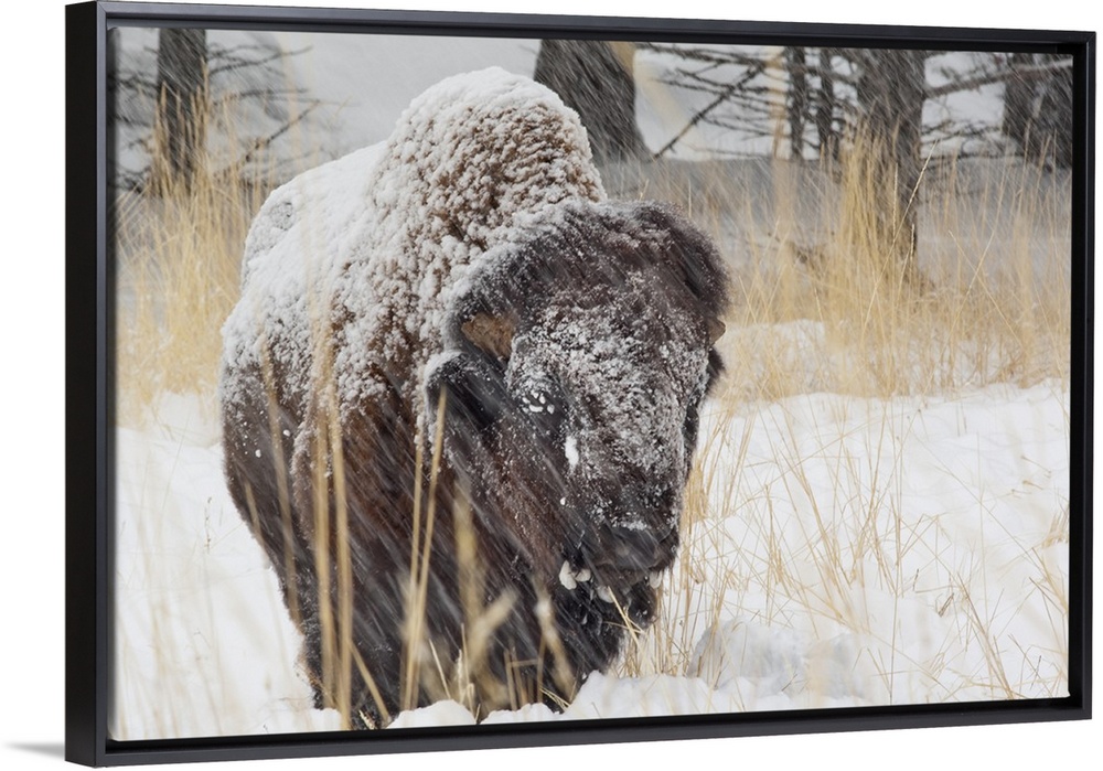 <p>Adult bison bull in snowstorm at Yellowstone National Park.</p>