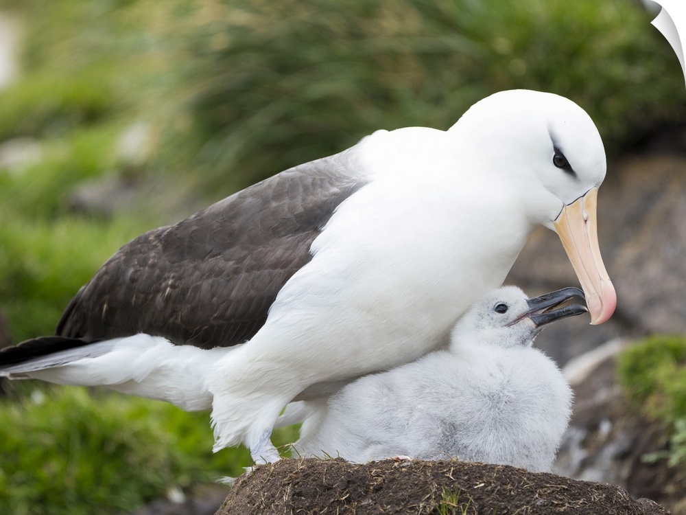 <p>Adult black-browed albatross feeding chick on tower-shaped nest, Falkland Islands.</p>