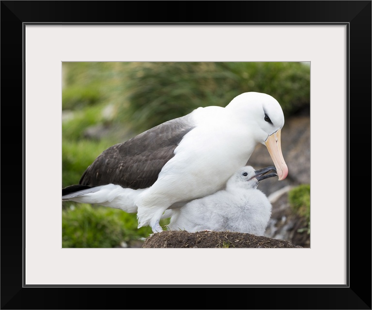 <p>Adult black-browed albatross feeding chick on tower-shaped nest, Falkland Islands.</p>