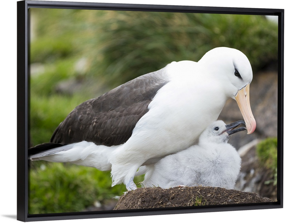 <p>Adult black-browed albatross feeding chick on tower-shaped nest, Falkland Islands.</p>