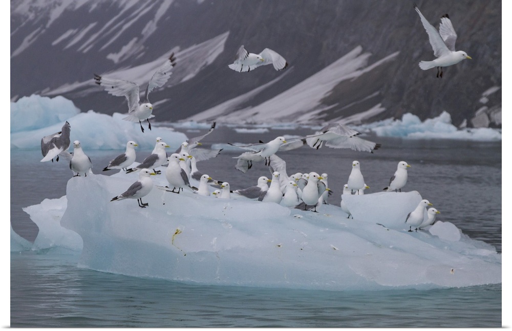 <p>Adult black-legged kittiwakes (Rissa tridactyla) resting on ice in the Svalbard Archipelago, Barents Sea, Norway, Arctic, Europe</p>