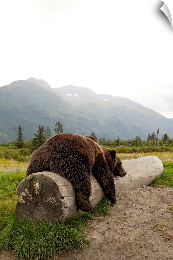 <p>Adult brown bear takes a nap on a fallen log with Alaskan mountains in the background.</p>