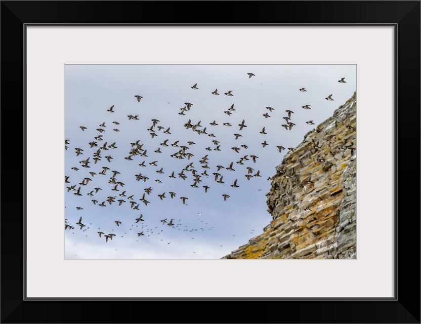 <p>Adult dovekies (Little Auk) (Alle alle) in flight at Rubini Rock, Tikhaya Bay on Hooker Island in Franz Josef Land, Russia, Arctic Ocean, Eurasia</p>