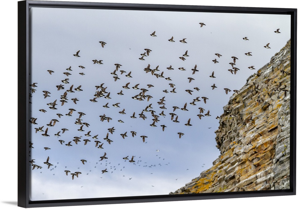 <p>Adult dovekies (Little Auk) (Alle alle) in flight at Rubini Rock, Tikhaya Bay on Hooker Island in Franz Josef Land, Russia, Arctic Ocean, Eurasia</p>