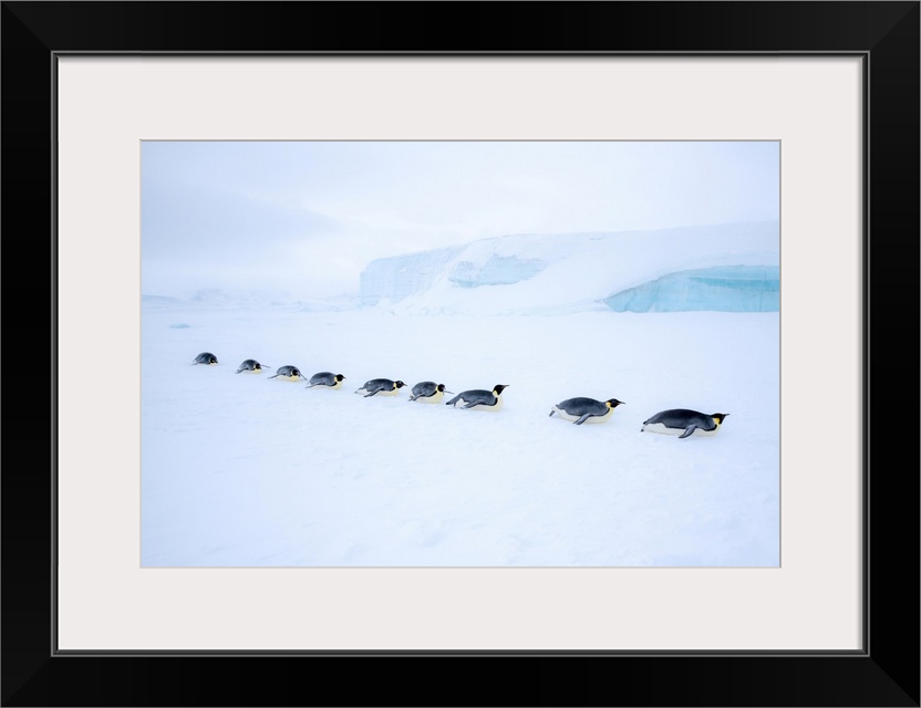 <p>Snow Hill Island, Antarctica. Adult Emperor Penguin tobogganing in a line to save energy while traversing the ice.</p>