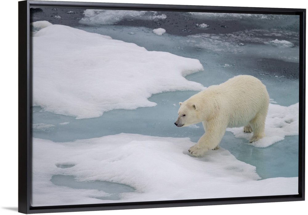 <p>Adult female polar bear (Ursus maritimus) walking on multi-year ice floes in Franz Josef Land, Russia, Arctic Ocean, Eurasia</p>