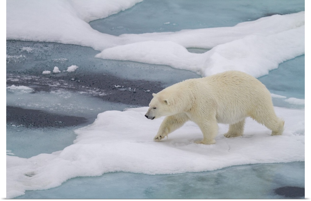 <p>Adult female polar bear (Ursus maritimus) walking on multi-year ice floes in Franz Josef Land, Russia, Arctic Ocean, Eurasia</p>