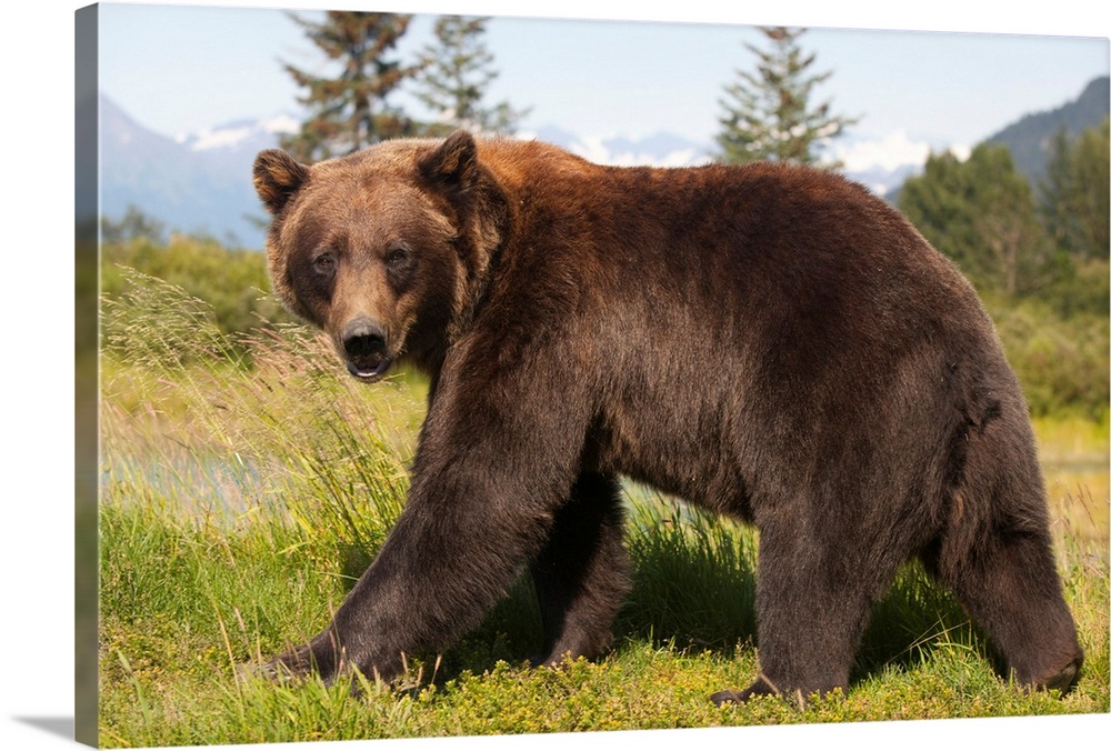<p>adult Grizzly bear stands in profile and looks over shoulder at the Alaska Wildlife Conservation Center, Southcentral Alaska</p>