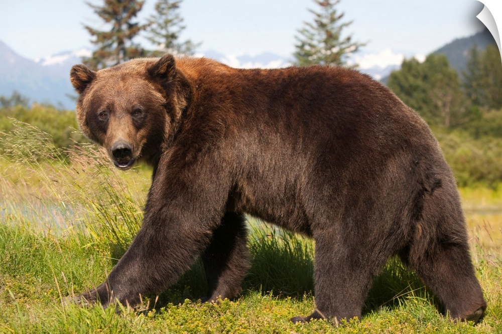 <p>adult Grizzly bear stands in profile and looks over shoulder at the Alaska Wildlife Conservation Center, Southcentral Alaska</p>