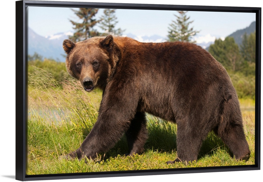 <p>adult Grizzly bear stands in profile and looks over shoulder at the Alaska Wildlife Conservation Center, Southcentral Alaska</p>