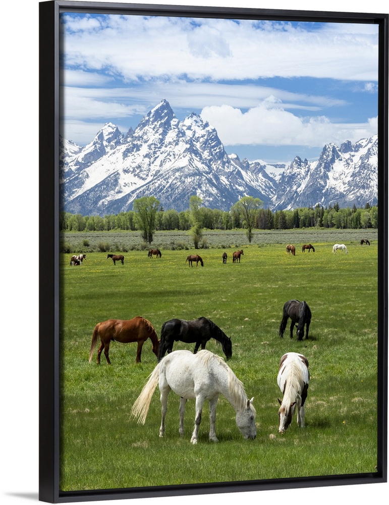 <p>Adult horses (Equus ferus caballus) grazing at the foot of the Grand Teton Mountains, Wyoming, United States of America, North America</p>