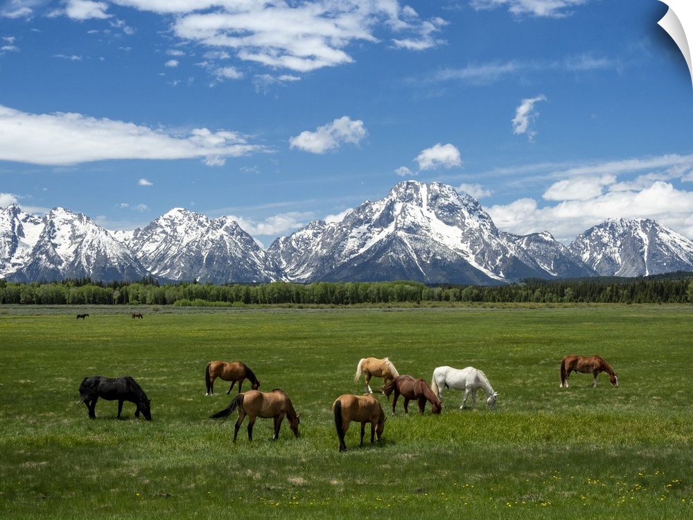 <p>Adult horses (Equus ferus caballus), grazing at the foot of the Grand Teton Mountains, Wyoming, United States of America, North America</p>