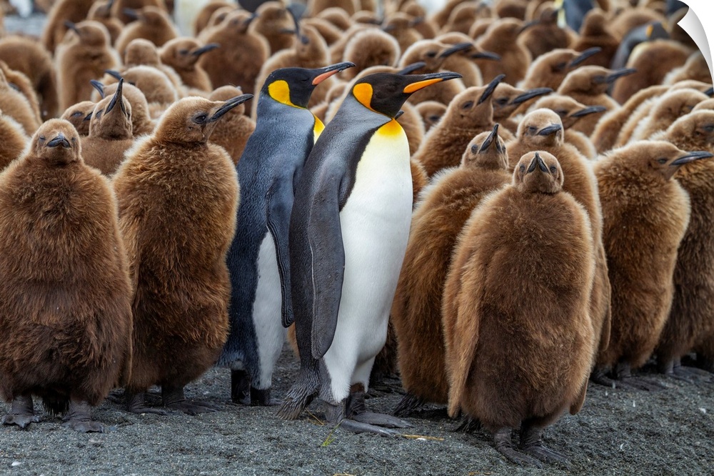 <p>Adult king penguins (Aptenodytes patagonicus) amongst chicks at breeding colony at Gold Harbour, South Georgia Island, Polar Regions</p>