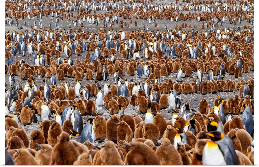 <p>Adult king penguins (Aptenodytes patagonicus) amongst chicks at breeding colony at Gold Harbour, South Georgia Island, Polar Regions</p>