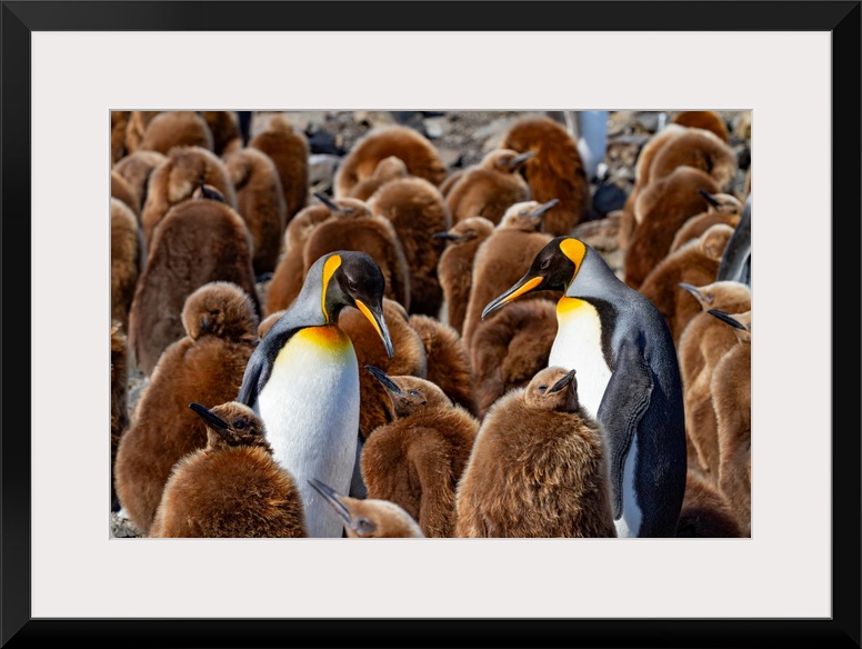 <p>Adult king penguins (Aptenodytes patagonicus) amongst chicks (okum boys) at Salisbury Plain, South Georgia, Polar Regions</p>