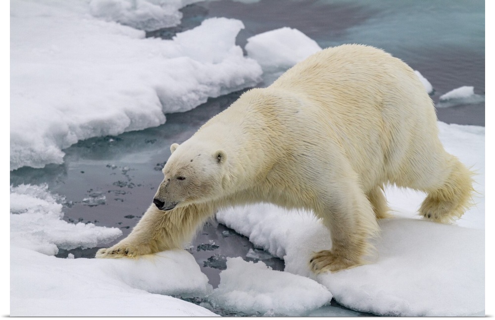 <p>Adult male polar bear (Ursus maritimus) on multi-year ice floes in Franz Josef Land, Russia, Arctic Ocean, Eurasia</p>