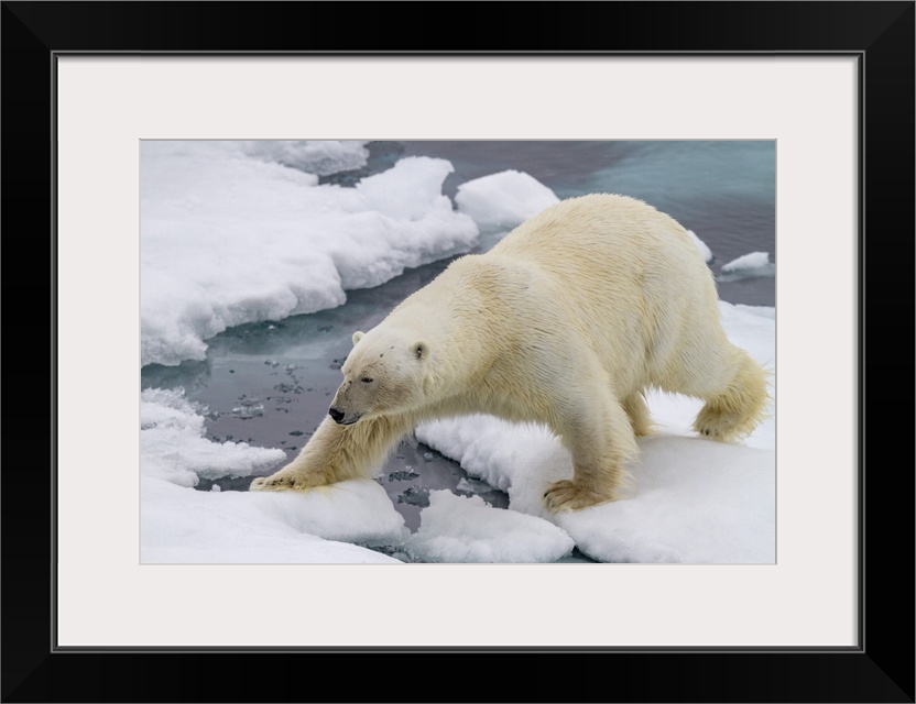 <p>Adult male polar bear (Ursus maritimus) on multi-year ice floes in Franz Josef Land, Russia, Arctic Ocean, Eurasia</p>