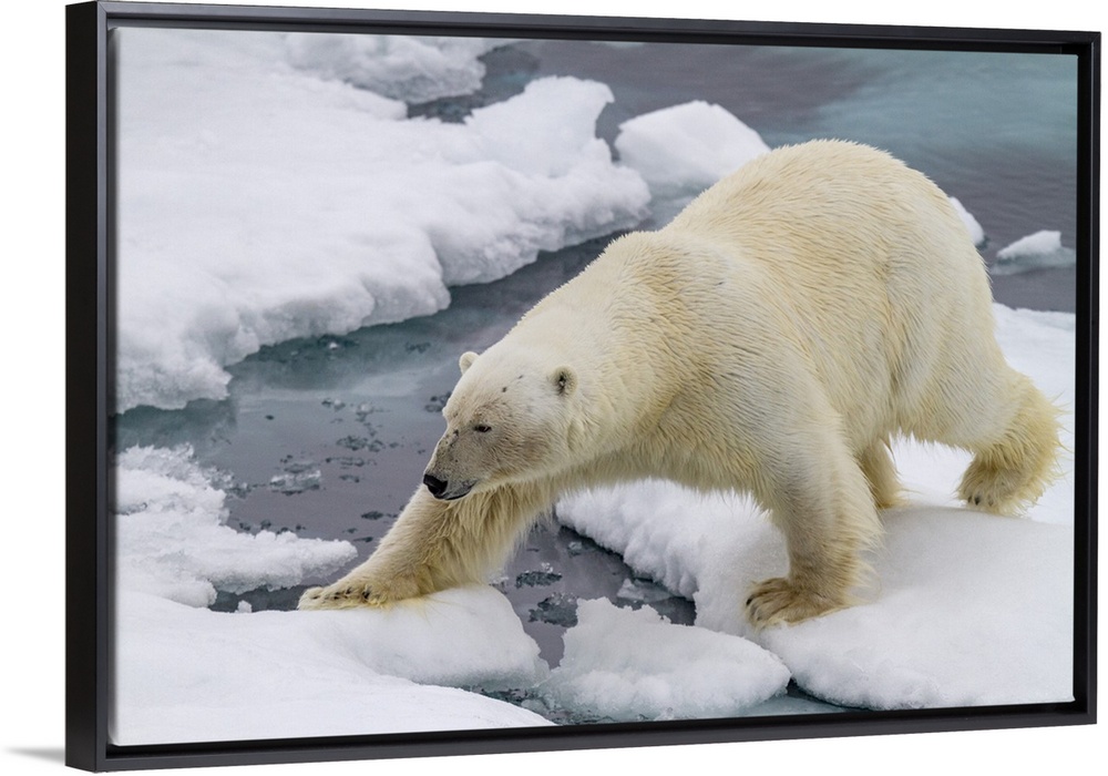 <p>Adult male polar bear (Ursus maritimus) on multi-year ice floes in Franz Josef Land, Russia, Arctic Ocean, Eurasia</p>