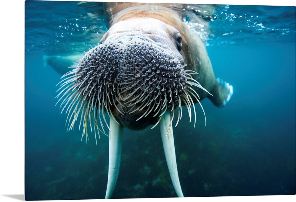 <p>Underwater view of an adult male walrus swimming near the surface near Lagoya on a summer afternoon. | Location: Lagoya, Svalabrd, Norway. . Photograph by Paul Souders.</p>