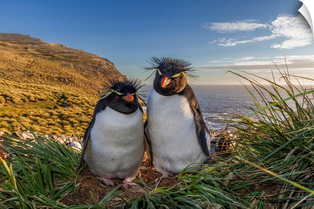 <p>Adult southern rockhopper penguins (Eudyptes chrysocome), at breeding colony on West Point Island, Falklands, South America</p>