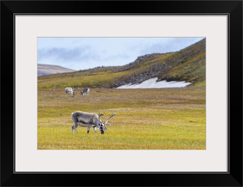 <p>Adult Svalbard reindeer (Rangifer tarandus platyrhynchus) grazing on tundra in the Svalbard Archipelago, Norway, Arctic, Europe</p>
