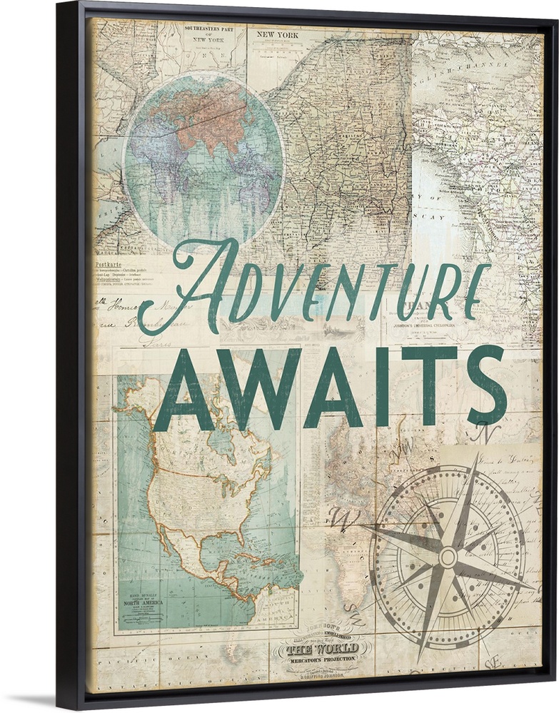 <p>Bold lettering over a variety of vintage maps and a compass rose design.</p>