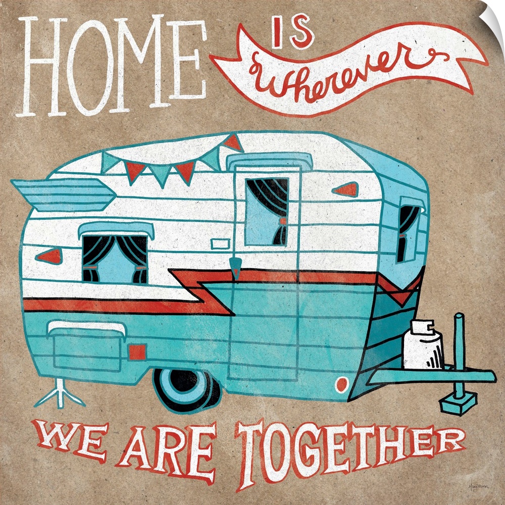 <p>Whimsical drawing of a camper in teal and red with handlettered text.</p>