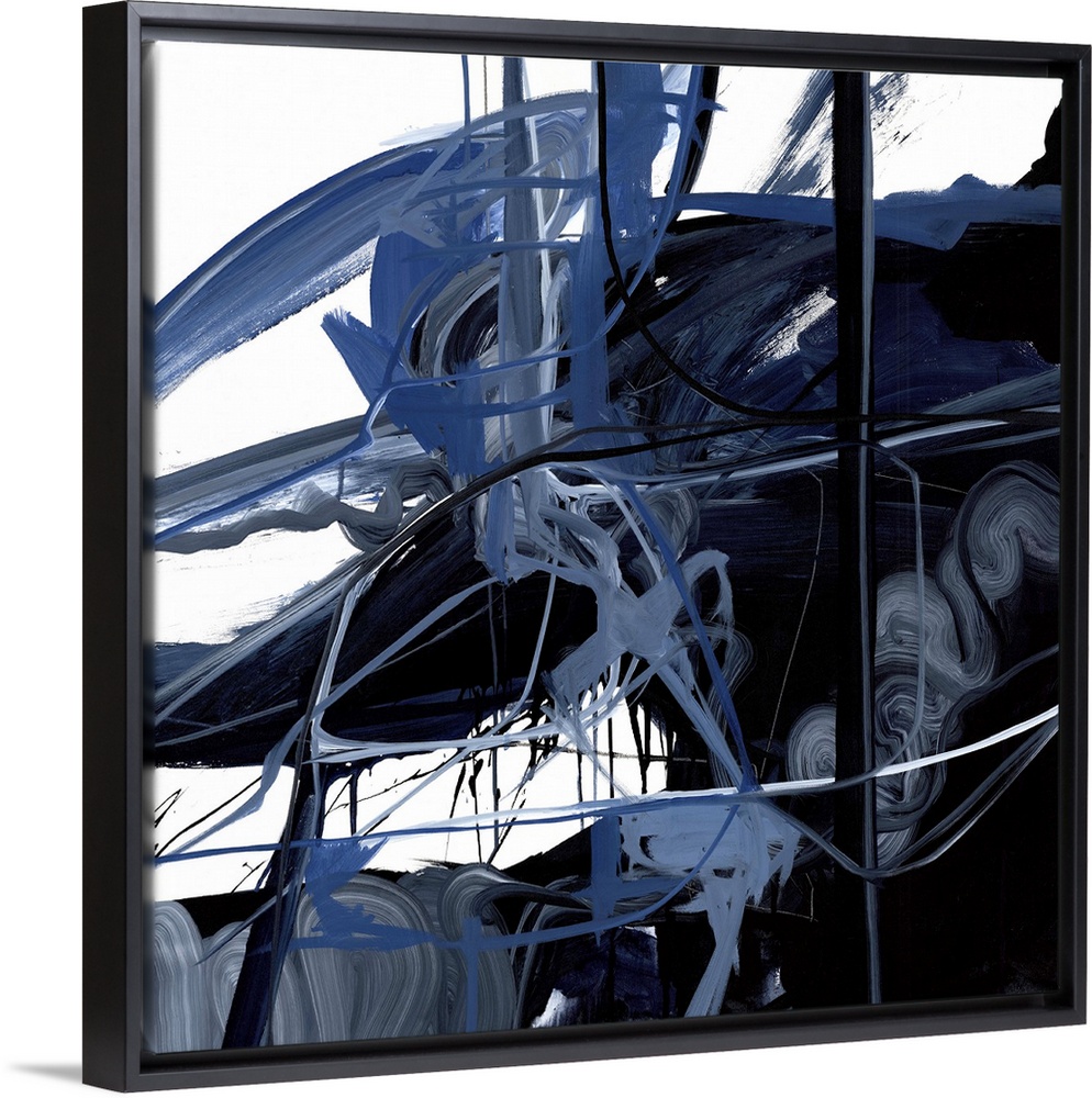 <p>A contemporary abstract painting of dark blue and black splashes of paint on an off-white surface.</p>