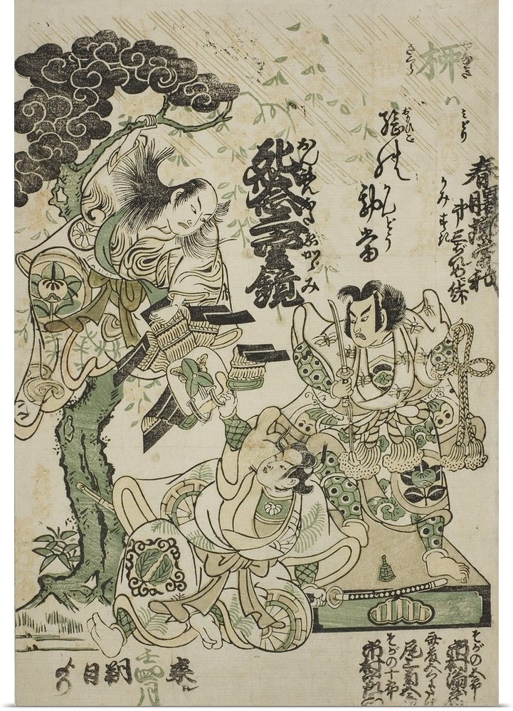 <p>Advertisement of the drama Haru no Akebono Kuruwa Soga, at the Ichimura Theatre, hand-coloured woodblock print.</p>