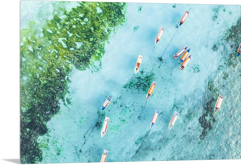 <p>Aerial view of anchored boats in the exotic blue lagoon, Zanzibar, Tanzania, East Africa, Africa</p>