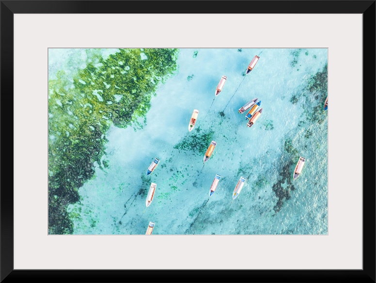 <p>Aerial view of anchored boats in the exotic blue lagoon, Zanzibar, Tanzania, East Africa, Africa</p>