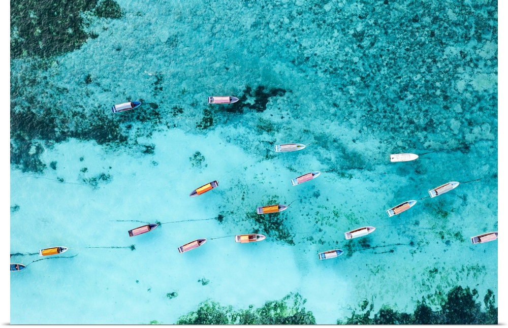 <p>Aerial view of anchored boats in the exotic lagoon, Zanzibar, Tanzania, East Africa, Africa</p>