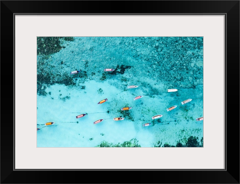 <p>Aerial view of anchored boats in the exotic lagoon, Zanzibar, Tanzania, East Africa, Africa</p>