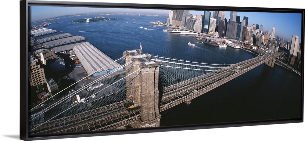 <p>Panorama of the Brooklyn Bridge, skyscrapers and boats in the East River of New York City.</p>