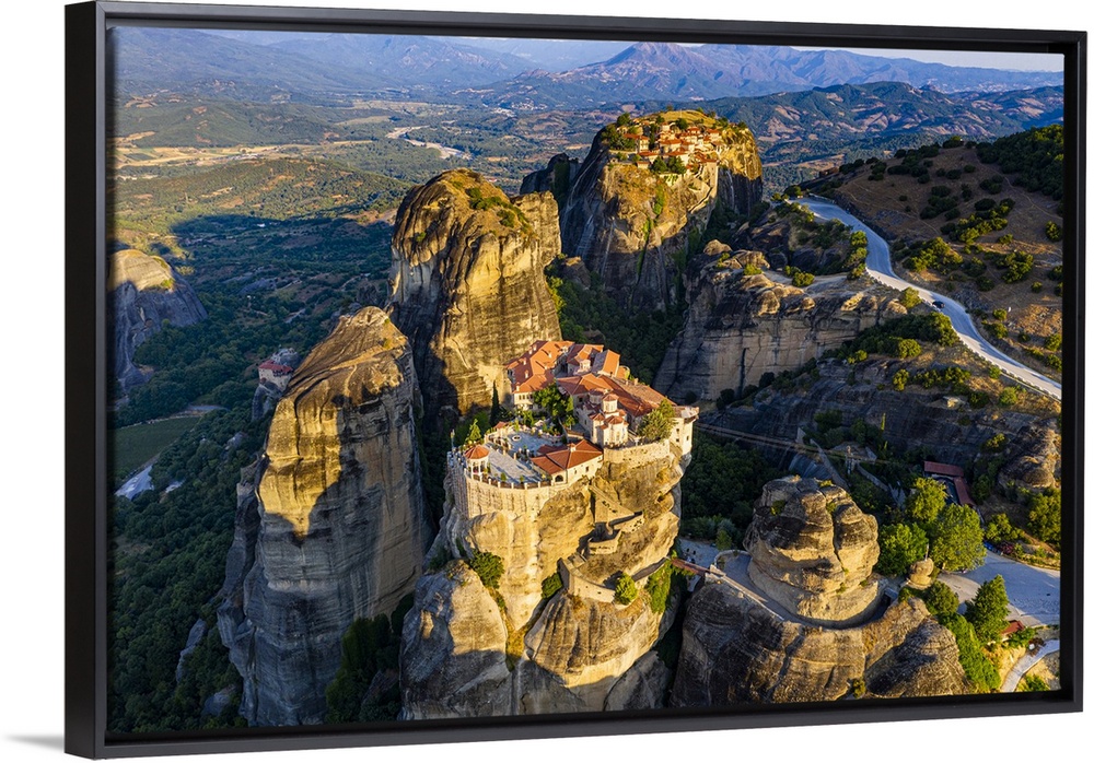 <p>Aerial by drone of the Holy Monastery of Varlaam at sunrise, UNESCO World Heritage Site, Meteora Monasteries, Greece, Europe</p>