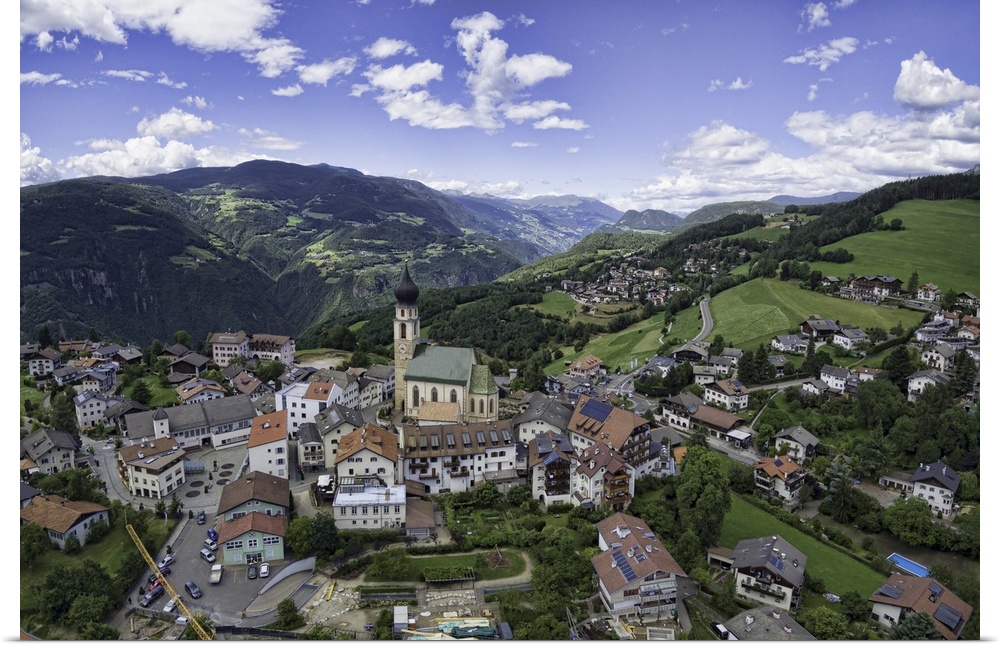 <p>Aerial capture of a church in Vols Am Schlern, Northern Italy.</p>