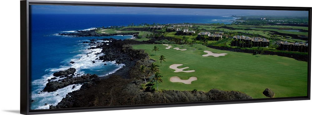 <p>Giant, horizontal, aerial photograph that overlooks bright blue waters meeting the coast surrounding the Francis H Li Brown golf course in Hawaii.</p>