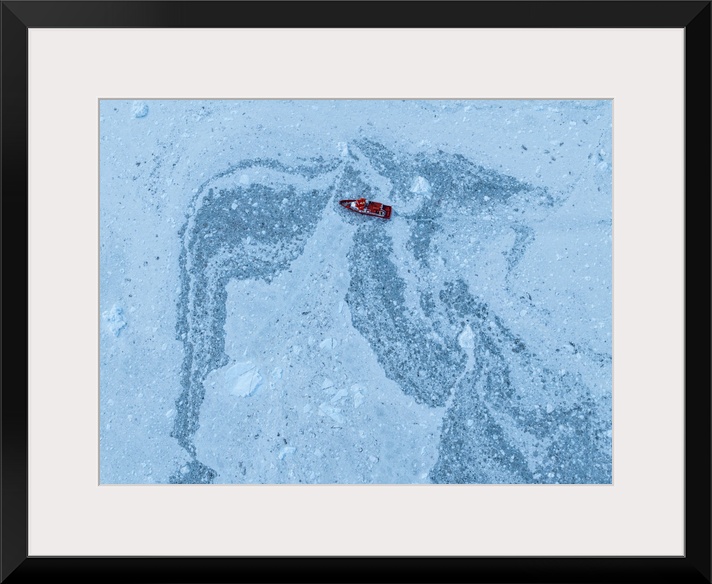 <p>Aerial of a little ship floating between the ice below the Eqi glacier, Western Greenland, Denmark, Polar Regions</p>