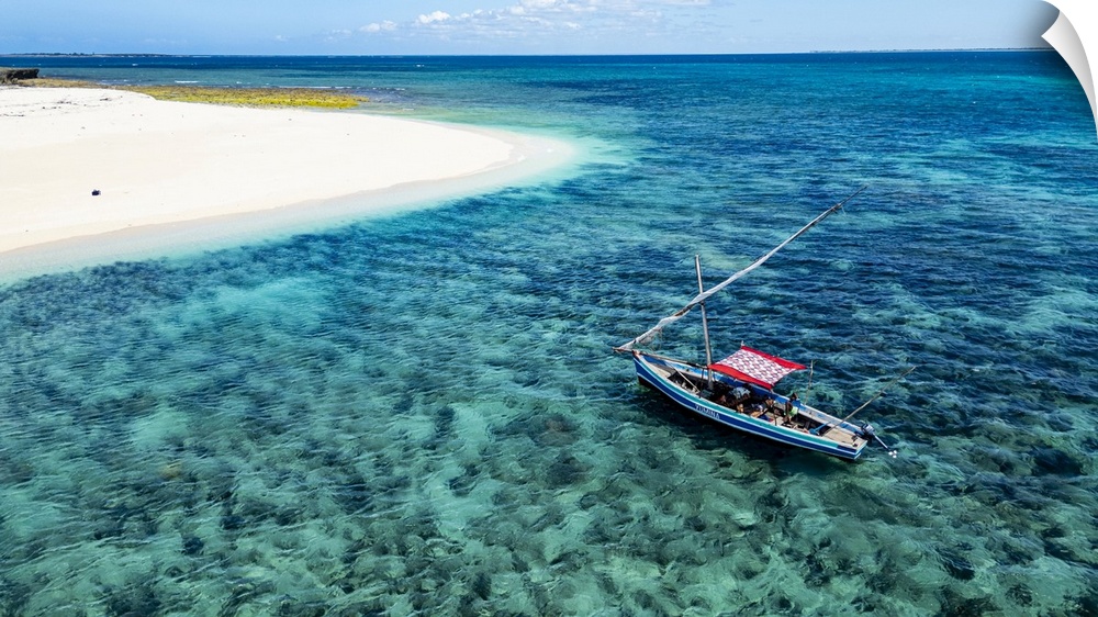 <p>Aerial of a traditional Dhow on a white sand beach, Goa island near the Island of Mozambique, Mozambique, Africa</p>