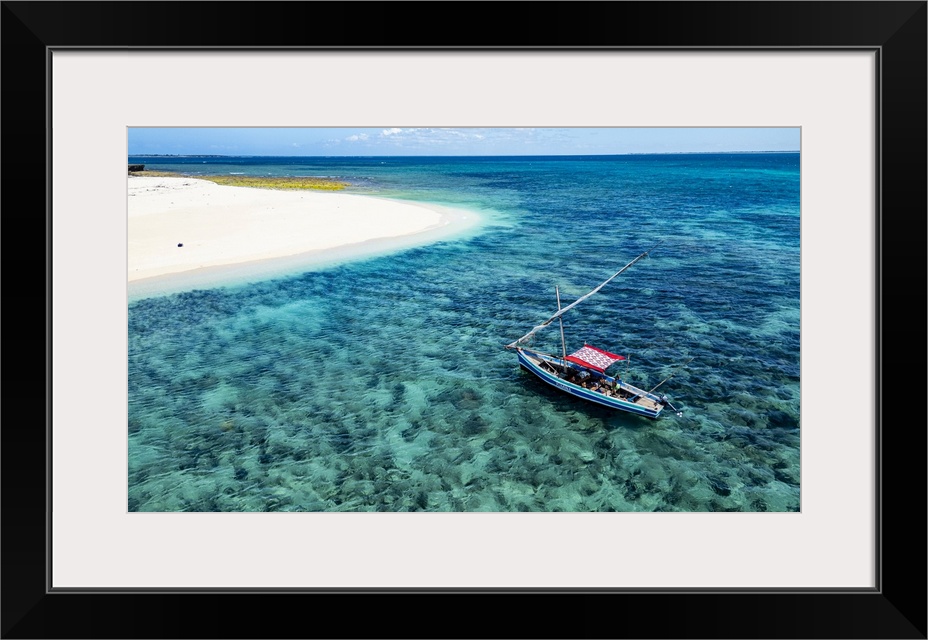 <p>Aerial of a traditional Dhow on a white sand beach, Goa island near the Island of Mozambique, Mozambique, Africa</p>