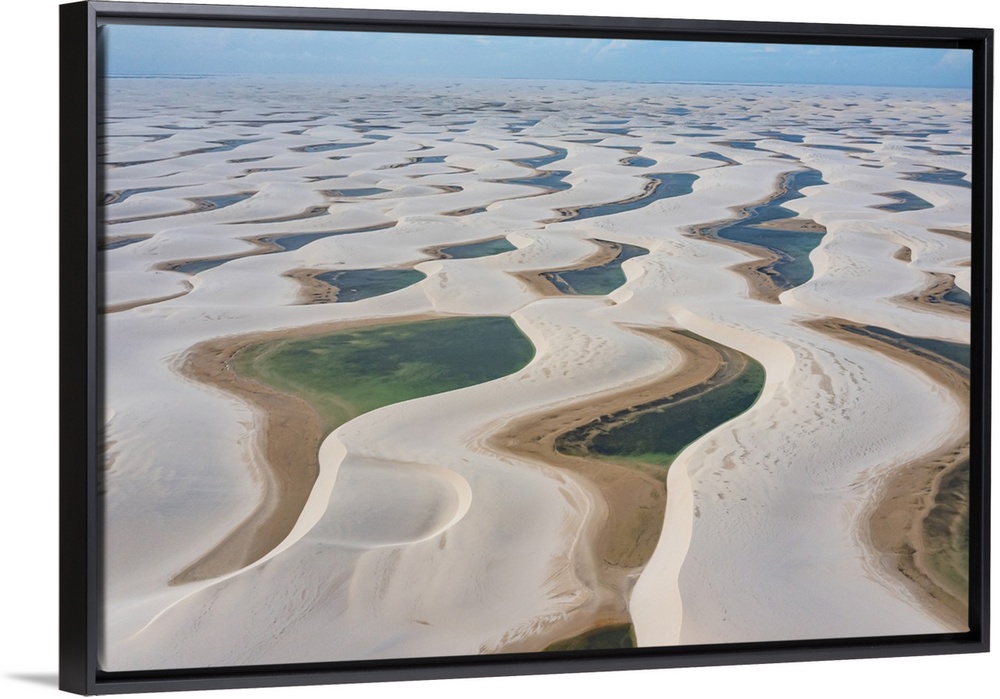 <p>Aerial of freshwater lakes between huge sand dunes in the Lencois Maranhenses National Park, Maranhao, Brazil, South America</p>