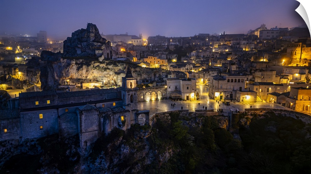 <p>Aerial of Sassi di Matera at night, UNESCO World Heritage Site, Basilicata, Italy, Europe</p>