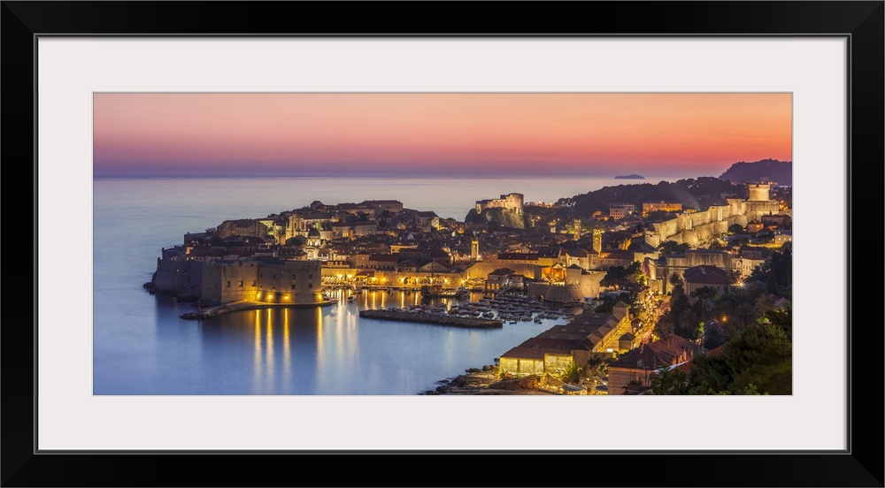 <p>Aerial panorama of Dubrovnik Old Town at night with orange sunset sky, Dubrovnik, Dalmatian Coast, Croatia</p>