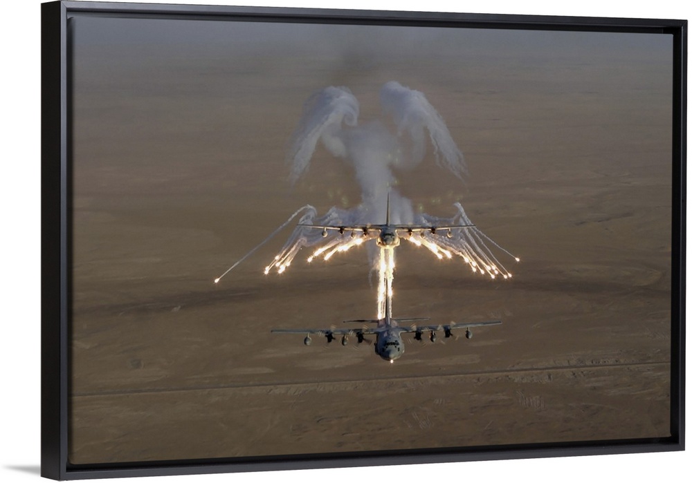 <p>Aerial shot over Iraq of a KC-130 Stratotanker firing flares.</p>